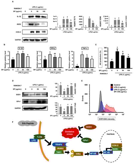 Effects of SP on production of pro-inflammatory cytokines and inflammatory responses by RAW264.7 macrophages. RAW264.7 cells were pretreated with SP (0, 50, and 100 µg/mL) for 3 h and then treated with LPS (1 µg/mL) for another 18 h. (A) Expression of IL-1β, iNOS, and COX-2 by RAW264.7 cells was determined by western blotting (mean ± SEM; n = 3). GAPDH was used as a control. (B) Cytokine levels in the culture medium of RAW264.7 cells were estimated (mean ± SEM; n = 3). (C) Levels of NO in the culture medium of RAW264.7 cells were analyzed using Griess reagent (mean ± SEM; n = 3). (D) Expression of SOD1 and GPx1 in RAW264.7 cells was measured by western blot analysis (mean ± SEM; n = 3). GAPDH was used as a control. (E) Levels of ROS in RAW264.7 cells pretreated with SP (100 µg/mL) for 3 h and then treated with LPS (1 µg/mL) for 18 h were measured by flow cytometry following incubation with DCFH-DA (mean ± SEM; n = 3). (F) Graphical abstract. Statistical significance was determined using one-way ANOVA followed by Duncan’s test. Datasets denoted by different letters are significantly different (p < 0.05, a > b > c > d).