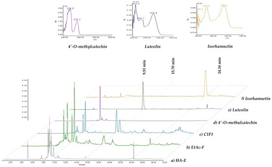 The HPLC analysis revealed that HA-E contained phenolic compounds (Figure 1a), while EtAc-F contained hydroxycinnamic acid derivate compounds and flavonoids (Figure 1b). It is important to mention that isorhamnetin is a flavonoid compound that has been previously isolated from several plant species including Persicaria glabra [25] and Cleome africana [32].