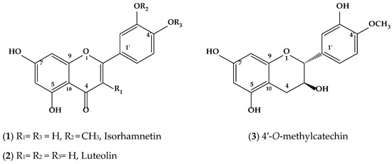 The analysis of spectra allowed researchers to identify compounds present in sub-fractions of P. laevigata extracts and revealed the presence of three flavonoids, isorhamnetin, an isorhamnetin-luteolin mixture, and luteolin. Furthermore, 4′-O-methylcatechin, which is a polyphenolic compound, was identified (Figure 2).