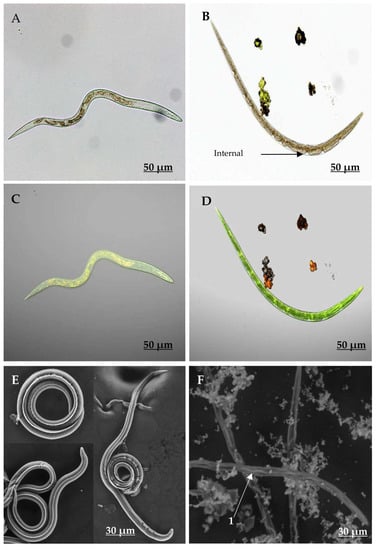 Differences observed using AxioCam CLSM and ESEM between non-exposed and isorhamnetin-exposed larvae (at 7.5 mg/mL) are shown in Figure 4. Non-exposed larvae displayed a sharpness and depth that resulted from the capacity of light to freely pass through their bodies. Furthermore, no apparent changes in their body conformation, intestinal cell organisation or in their external cuticle, were observed (Figure 4A,C,E). In contrast, the bodies of isorhamnetin-exposed larvae showed some changes in their internal organs, including the loss of architectural integrity of intestinal cells (Figure 4B). Likewise, some morpho-anatomic changes were observed in the isorhamnetin-exposed larvae ie., the presence of an irregular dark colour that diffused throughout the larval body length as well as some irregular pale spaces between the surface coat and the inner coat that resembled tissue folds (Figure 4B,D). The ESEM of the isorhamnetin non-exposed larvae showed a normal smooth cuticular surface without any apparent abnormal changes (Figure 4E). In contrast, the bodies of isorhamnetin-exposed larvae appeared deformed, with loss of internal organ integrity (Figure 4F). In addition, these larvae also showed changes in their external cuticle, which appeared rough and straight with wavy formations mainly in their lateral nervous cords along the body (4 F-1). Furthermore, the transversal size of exposed larvae was reduced in comparison with non-exposed larvae (Figure 4F).