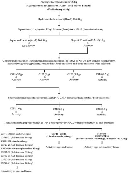 Bio-guided fractioning process to identify compounds with anthelmintic activity from Prosopis laevigata leaves against Haemonchus contortus eggs and larvae (L3).
