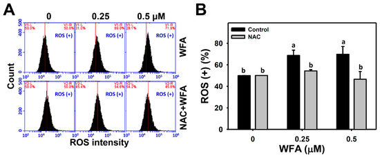 ROS generation effects of low concentrations of WFA in oral cancer cells. (A) ROS patterns of Ca9-22 cells after NAC and/or WFA treatments. Cells were pretreated with or without NAC (2 mM, 1 h) and post-treated with different concentrations of WFA for 24 h, i.e., NAC + WFA vs. WFA. ROS-positive population is marked as ROS (+). (B) Statistics of ROS change in Figure 2A. For multiple comparison, treatments without the same labels (a,b) indicate the significant difference. p < 0.05~0.001. Data, mean ± SD (n = 3).