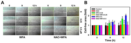 Wound healing assay was used to detect 2D migration ability as described previously [22,23]. The non-migrated cell-free area for vehicle, NAC, WFA, and NAC + WFA (NAC pretreatment and WFA posttreatment) in oral cancer cells were measured using the free software “TScratch” (https://www.cse-lab.ethz.ch/software/).