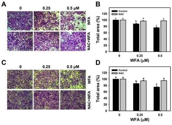 Three-dimensional anti-migration and -invasion effects of low concentrations of WFA in oral cancer cells. (A,C) 3D migration and invasion images of Ca9-22 cells after NAC and/or WFA treatments. Cells were pretreated with or without NAC (2 mM, 1 h) and post-treated with different concentrations of WFA for 21 h. (B,D) Statistics of 3D migration and invasion changes in Figure 4A,B. For multiple comparison, treatments without the same labels (a–c) indicate the significant difference. p < 0.001~0.0001 (B) and p < 0.01~0.001 (D). Data, mean ± SD (n = 3).