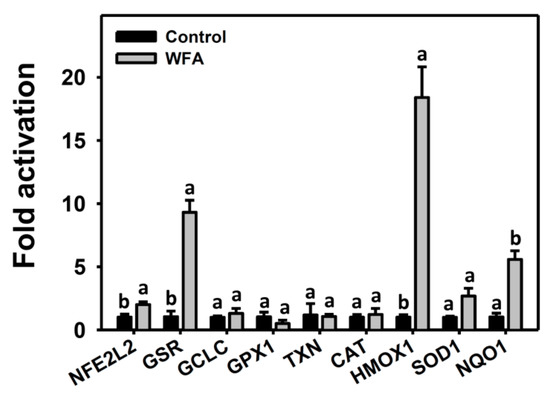 mRNA expressions of antioxidant genes of low concentrations of WFA in oral cancer cells. Cells were treated with or without 0.5 μM of WFA for 24 h. Treatments (control vs. WFA) without the same labels (a,b) indicate the significant difference. p < 0.05~0.01. Data, mean ± SD (n = 2).