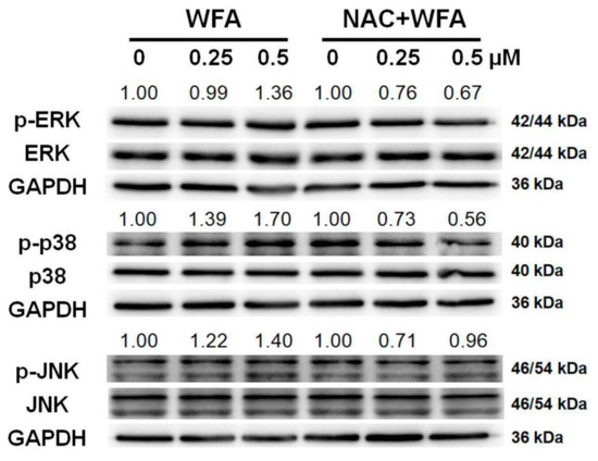 To further detect the potential upstream antioxidant signaling in oral cancer cells after low concentrations of WFA treatment, the activation of three members of MAPK, including ERK, JNK, and p38 MAPK was examined. Figure 7 showed that WFA induced phosphorylation of three MAPK members, i.e., p-ERK1/2, p-JNK1/2, and p-p38. In contrast, these WFA-induced MAPK phosphorylations were suppressed by NAC pretreatment. Therefore, low concentrations of WFA triggers MAPK phosphorylations in Ca9-22 cells.