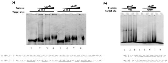 This region contains the well-characterized virB1 promoter [,] and the region starting at -143 bp from the ATG start codon of virB1 comprises AT-rich sequences containing multiple T–A steps. We designed two 60 bp oligonucleotides, the first one named vir60.1 starting at ‒143 bp from the virB1 ATG start codon and the second one, named vir60.2, starting at ‒83 bp from the virB1 ATG (Figure 3). We then examined the interactions of these two oligonucleotides with MucR in EMSAs. The results demonstrate that MucR can bind both the two 60 bp oligonucleotides tested (Figure 4a). To confirm that MucR binding sites are AT-rich sequences containing T–A steps also in the virB promoter, we carried out EMSAs of MucR using as target sites a 20 bp oligonucleotide named vp1, whose sequence is included in vir60.1 oligonucleotide, and a mutant of vp1 named vp1M, in which thymine and adenine bases constituting T–A steps were substituted by GC bases (Figure 4b). The results demonstrate that MucR can bind vp1 but fails to bind vp1M, indicating that AT-rich sequences containing T–A steps also represent important MucR binding sites in the virB promoter. In all the EMSAs carried out with 20 bp oligonucleotides, the highest amount of protein used does not result in more bound DNA. This is in agreement with what we observed with the other proteins of the Ros/MucR family and it is likely due to the aggregation propensity of these proteins being able to form higher-order oligomers [,].