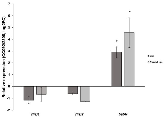 Relative expression of virB1, virB2 and babR in B. abortus 2308 (solid bars) and CC092 (hashed bars) after growth in Brucella broth (BB) or upon exposure to a virulence-inducing condition (E-medium). Asterisks indicate significant difference in relative expression (p value < 0.05) as determined by one sample t-test. The p value in the case of bars without asterisk is >0.05.