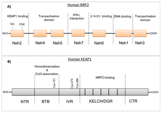 Kelch-like ECH-associated protein 1 (KEAP1) comprises 624 amino acids with a molecular weight of 69 kDa. KEAP1 interacts with NRF2, binding to the Neh2 domain as a homodimer and controls the stability of NRF2. KEAP1 belongs to the Broad complex Tramtrack and Bric-à-Brac (BTB)-Kelch family of proteins and these family members assemble with the Cul3-containing E3 ubiquitin ligase complex that induces the proteasomal degradation of target proteins [13,14]. KEAP1 consists of five domains (see Figure 1B); N-terminal region (NTR), the Broad complex Tramtrack and Bric-à-Brac (BTB) domain, the intervening region (IVR), the Kelch domain/double glycine repeat (DGR) and the C-terminal region (CTR) [15]. The N-terminal BTB domain mediates KEAP1 homodimerization and the Cul3-E3-ligase binding that is critical for ubiquitination and the proteasomal degradation of NRF2. Additionally, the BTB domain contains cysteine residue Cys151 that is thought to sense oxidative stress levels [16]. Similar to the BTB domain, the IVR domain consists of reactive cysteine residues; Cys257, Cys273, Cys288 and Cys297 that are particularly susceptible to reactive oxygen species (ROS)-induced modifications and promote KEAP1-dependent NRF2 ubiquitination [17]. The C-terminal Kelch domain includes six Kelch-repeats that mediate the binding of KEAP1 to the ETGE or DLG motifs located within the Neh2 domain of NRF2 [18]. The structural features of NRF2 and KEAP1 are reported in Figure 1.
