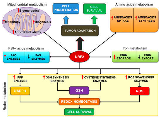 It is becoming increasingly clear that pro-oncogenic alterations of the NRF2/KEAP1 pathway play a crucial role in driving the metabolic rewiring of cancer cells, orchestrating a multi-layered transcriptional program that ultimately provides the precursor molecules to support cancer cell proliferation and the reducing equivalents to cope with the augmented bulk of intracellular ROS resulting from the malignant progression. In the next sections, we will describe the role of NRF2 in the regulation of tumor metabolism with a particular emphasis on the interconnection between some metabolic processes and the control of tumor redox homeostasis.