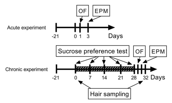 The most frequently used outcome measure of anhedonia is the sucrose preference test (SPT), and CUMS has been proved to decreased sucrose consumption. However, it might be unreliable, especially when it is applied to “normal” rats []. For the assessment of the behavioral aspects, the open field and elevated plus maze tests were performed at days 1 and 3 in the acute experiment and at days 29 and 31 in the chronic experiment to measure anxiety-like behavior and exploratory and locomotor activity (Figure 1).