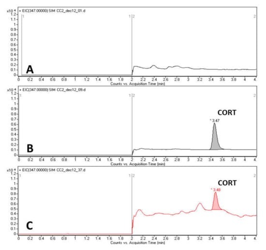 Hair samples were collected before and after the CUMS procedure for CORT assay. To obtain hair samples without hair follicles, the interscapular area of each animal was shaved three times: on the first day of the habituation (day 21, CORT was not assayed in these samples) and on the first and the last day of the stressing period (day 0 and day 32, respectively). The samples were rinsed two times (2 min) in 2 mL methanol at room temperature and dried for 24 h, then 50–100 mg of the samples was pulverized in a grinding ball mill (UltraTurrax Tube Drive, IKA, Königswinter, Germany). Samples of powdered hair were incubated overnight in 4 mL methanol for CORT extraction. The supernatant was separated, then evaporated to dryness at 37 °C (SpeedVac, Savant, Thermo Fisher, Waltham, MA, USA). The dried residue was reconstituted in methanol (0.2 mL). For precipitation, a volume of 20 μL of 0.1% formic acid (v/v) in deionized water was added to 150 μL of sample solution, then vortex-mixed (1 min) and centrifuged for 10 min at 10,000 rpm (Sigma 2-15 centrifuge, Sigma, Osterode am Harz, Germany). A liquid chromatography–mass spectrometry (LC–electrospray ionization (ESI)-MS/MS) method was developed and implemented for the quantification of CORT, using an Agilent 1100 Series HPLC system coupled with a triple quadrupole mass spectrometer (Agilent Triple Quad G6410A, Agilent Technologies, Santa Clara, CA, USA). The chromatographic separation was performed on a C18 reversed-phase silica gel column (Kinetex Polar C18 100 × 4.6 mm, 2.6 µm, Phenomenex, Torrance, CA, USA) with 0.1% formic acid/acetonitrile (60:40 v/v, 0.6 mL/min flow rate) isocratic elution. The mobile phase was directed to the detector only in the time range of 2.0–4.0 min using a switching valve, including the retention time of CORT (RtCORT = 3.47 min). At all other times, it was directed to the waste. The evaporation at the ESI interface was performed with a 10 l/min N2 gas flow at 350 °C. CORT was quantified without fragmentation, in positive single-ion monitoring (SIM) mode, by detecting the 347 m/z molecular ion, as published previously []. Figure 2 represents the characteristic chromatograms obtained with this method.