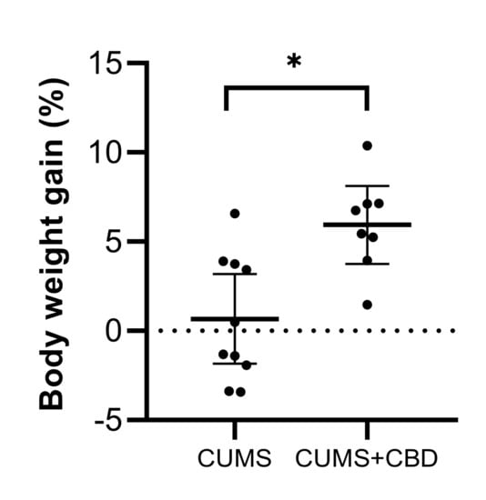 In this study, chronic CBD treatment showed complex behavioral and neuroendocrinological effects in rats exposed to chronic stress. Behavioral despair, anhedonia, and anxiety-like behavior are common signs of depression, which can be identified in rodents as diminished nutrition, disinterest for sucrose or exploration, and reduced tenacity in swimming [,]. The absence or improvement of these behavioral patterns, as in our study, can be interpreted as a reduction of stress and prevention of depression. Body weight loss, as an auxiliary indicator of depression was significantly attenuated in the CBD-treated group compared to control rats. This could seem to contradict previous results in which CBD was shown to reduce body weight gain in rats [] and induce the browning of white adipocytes promoting thermogenesis and lipolysis []. However, CBD at 10 mg/kg dose did not decrease the body weight of juvenile rats after a three-week treatment []. Moreover, contradicting results were also presented, with CBD increasing the body weight gain in adult rats kept on a high-fat diet in spite of reduced food intake []. In this study, the body weight changes of rats that underwent CUMS could reflect the summed impact of stress, food deprivation applied as stressor, and sucrose consumption. It was demonstrated very recently that a 24 h food deprivation may directly affect body weight []. Assuming that food access was the same across groups, the body weight gain induced by CBD may be linked to the reduction of stress and to the increase in sucrose consumption. Indeed, long-term sucrose consumption can produce body weight gain in rats also []. One of the limitations of this study is the lack of data regarding the impact of the CBD treatment on body weight gain in non-stressed controls.