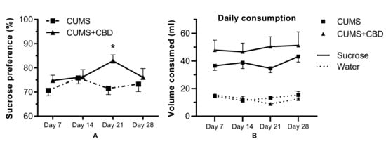 Results of the sucrose preference test for rats submitted to a four-week CUMS treatment with or without cannabidiol administration (mean ± SEM, n = 18). (A.) Sucrose preference measured as % preference for sucrose; (B.) sucrose (mL of 1.0% sucrose solution ingested) and water intake on each testing day. CBD, cannabidiol; * p < 0.05 vs baseline.