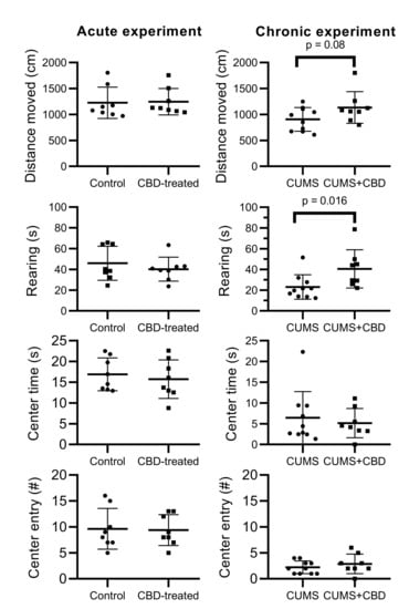 Results of the open field test in the two experiments. The first column represents the acute experiment, where non-stressed animals received a single dose of vehicle or 10 mg/kg of CBD. The second column shows the chronic experiment, where the animals were treated for 32 days with vehicle or 10 mg/kg of CBD and were subjected to the CUMS protocol. Means ± SEM (n = 8–10) are presented. Data were analyzed with unpaired t-test or Mann–Whitney test. The dots represent individual values, * p < 0.05.