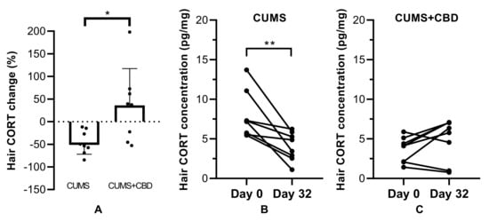 Hair corticosterone (CORT) levels in rats subjected to a four-week CUMS procedure and CBD treatment (10 mg/kg body weight) for 32 days. Samples were taken at day 0 and at day 32 (before and after CUMS). Means ± SEM (n = 8–10 per group) are presented. Data were analyzed by two-way ANOVA with repeated measures for the factors time and treatment. (A) Hair corticosterone change expressed as percentage with respect to baseline value; (B,C) hair corticosterone levels before and after CUMS. The dots represent individual values; * p < 0.05, ** p < 0.01.