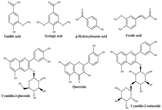 Interest in EO is currently increasing not only because of its wide use in the food and cosmetic industries, but also because of its potential in the pharmaceutical sector [17]. Different parts of EO such as fruits, leaves, roots, and fruit oil have in fact been studied for pharmacological application, suggesting different biological activities according to their chemical composition. A variety of phenolic acids, among which are vanillic, syringic, p-hydroxybenzoic, protocatechuic, and ferulic acids, as well as (+)-catechin and procyanidin oligomers, have been identified in high concentrations in EO pulp and oil extracts [29] (Figure 1 and Table 1).