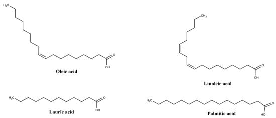 EO oil, which is extracted from the pulp or seed of the fruit, consists mainly of fatty acids, whose major constituent is oleic acid (47.58%), followed by palmitic (24.06%) and linoleic (13.58%) acids (Figure 2), while palmitoleic, vaccenic, lauric and stearic acids were detected in minor concentrations [25]. Melhorança Filho and Pereira [23] and Magalhães et al. [25] ascribed significant antibacterial activity, Favacho et al. [19] anti-inflammatory and antinociceptive effects, and Souza et al. [40] antilipemic action to the oil. A study by Pacheco-Palencia et al. [29] also reported the presence of polyphenolic compounds and anthocyanins retained in the oil, among which are procyanidin dimers, procyanidin trimers, vanillic acid, and syringic acid (Table 1), which contribute to its significant antioxidant activity.