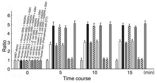 The E. coli Grx1 mutant had little effect on MST activity with GSH. MST activity with or without GSH after a 10 min incubation increased to 1.24- or 1.16-fold, respectively from before incubation; however, the difference was not significant (p = 9.21 × 10−2 and p = 8.52 × 10−2, respectively). Bushweller et al. [9] reported that Cys14 on E. coli Grx1 was a binding site for GSH and replacement of the Cys with Ser decreased activity to 38% of full.