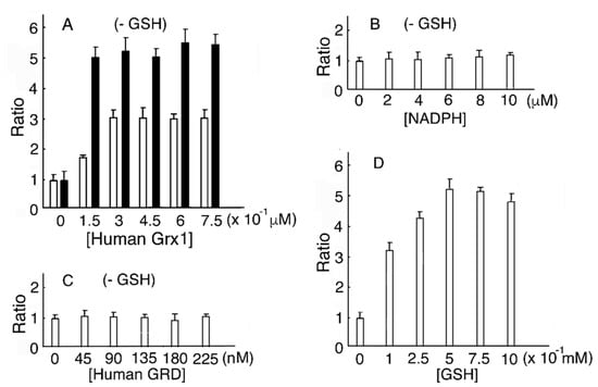MST activation was completed at around 5 min, and therefore, we measured activity at 10 min in this experiment. As shown in Figure 1, MST activity was increased by 3.01-fold in the reducing system containing human Grx1 (final concentration 0.6 μM), human GRD (final concentration 90 μM), and NADPH (final concentration 8 μM); by 4.13-fold in the system containing human Grx1, human GRD, NADPH, and GSH (final concentration 0.5 mM); by 2.95-fold in the system containing human Grx2 (final concentration 0.6 μM), human GRD, and NADPH; by 3.92-fold in the system containing Grx2, human GRD, NADPH, and GSH; by 3.02-fold in the system containing E. coli Grx1 (final concentration 1.5 μM) (p = 1.69 × 10−1), E. coli GRD, and NADPH; and by 1.10-fold in the system containing E. coli Grx1 mutant, E. coli GRD, NADPH, and GSH (p = 3.52 × 10−1). When MST was treated with 1.2 M DTT, MST activation increased to about 1.5-fold of control, consistent with the previous results [44] (data not shown). Further, when human Grx 1 was pretreated with 1.2 mM DTT, MST activity increased to about 5-fold of control, also consistent with the previous results [44]. Even when the reducing system did not contain GSH, MST activity was increased. This is probably because residual Grx in a reduced form donates electrons to MST until depleted. When GSH was present in the system, activity increased to between 1.58- and 1.70-fold of the values without GSH.