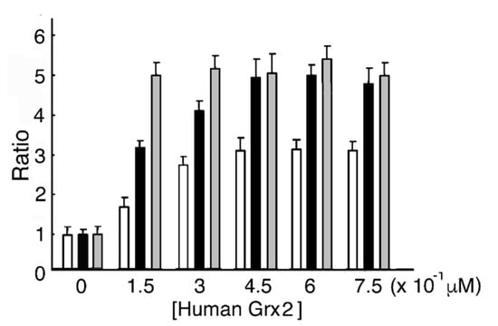 The incubation mixture contained 0, 0.3, 0.6, 0.9, 1.2, or 1.5 μL of human Grx2 solution in 20 μL of incubation mixture (final concentrations: 0, 0.15. 0.3, 0.45, 0.6, and 0.75 μM, respectively) with or without 1 μL of GSH solution.