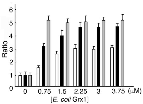 In a reducing system containing E. coli Grx1, E. coli GRD, and NADPH with or without GSH, MST activity reached a maximum value (4.78- and 3.03-fold of that without E. coli Grx1, respectively) at 2.25 μM E. coli Grx1. As a control, MST was incubated DTT-pretreated E. coli Grx1. The ratio of MST activity showed a maximum value (5.4) (Figure 4). Our results show that MST activity at 2.25 μM E. coli Grx1 and 0.5 mM GSH increased to 1.56-fold of that at 2.25 μM E. coli Grx1 without GSH (p = 7.47 × 10−2). When the reducing mixture did not contain GSH, residual reduced E. coli Grx1 donated electrons to MST until depletion. Compared to eukaryotic Grxs, about 5 times the amount of E. coli Grx1 is required to serve as an equivalent electron donor for eukaryotic MST. This experiment suggests that prokaryotic Grx is less effective on eukaryotic proteins than the eukaryotic form. This finding is opposite to the results for prokaryotic Trx, which more effectively reduces eukaryotic proteins than does eukaryotic Trx; this difference is probably due to structural properties [44,45,46,47].