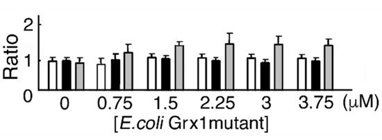 The incubation mixture contained 0, 0.5, 1, 1.5, 2, or 2.5 μL in 20 μL of E. coli Grx1 solution and 20 μL of incubation mixture (final concentrations: 0, 0.75, 1.5, 2.25, 3, and 3.75 μM, respectively) with or without 1 μL of GSH solution.