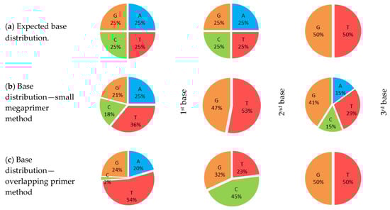 Directed evolution procedures, such as (iterative) saturation mutagenesis, require a high-efficiency transformation of the mutagenesis product, providing a sufficient number of colonies for the 95% coverage of residue randomization, 96 colonies in case of a single-site NNK degeneracy. In order to generate the requested high colony number both heat shock and electroporation transformation of the PCR products obtained through the partially overlapping primers strategy and by the optimized small-sized megaprimer strategy were tested using BL21 (DE3) pLys, Rosetta (DE3) pLys, or BL21 (DE3) Gold strains E. coli competent cells. While by heat-shock, low transformation efficiency (<10 colonies) was obtained for both PCR products for each host strains, the electroporation protocol provided <31 colonies in case of E. coli BL21 (DE3) pLys, Rossetta (DE3) pLys and >140 colonies in case of BL21 (DE3) Gold host. Further, to evaluate the diversity and quality of libraries obtained by the partially overlapping primers and the small-sized megaprimer mutagenesis methods, we compared the distribution of the encountered bases at the degeneracy site for the plasmids isolated from the pooled agar plate of the two transformant libraries with the values expected of NNK-degeneracy (Figure 2, Figure S1). While the transformant library generated by the small-megaprimer mutational strategy resembled the theoretical base distribution, in case of the partially overlapping primer strategy-derived library, within the first and second base of the NNK-degeneracy, cytosine (C) was underrepresented or completely missing, with a high dominance of thymine (T) within the first degenerated nucleotide. Accordingly, from the two transformant libraries, only the higher-quality one generated by the small megaprimer-strategy limits the occurrence of amino acid bias and ensures that all the desired mutations are present within the transformant library. The differences in the distribution percentages for the different bases, obtained for the small megaprimer-transformant library, with respect to the theoretical one, is similar to those observed in previous saturation mutagenesis studies [] and approaches the limits of saturation mutagenesis procedures [].