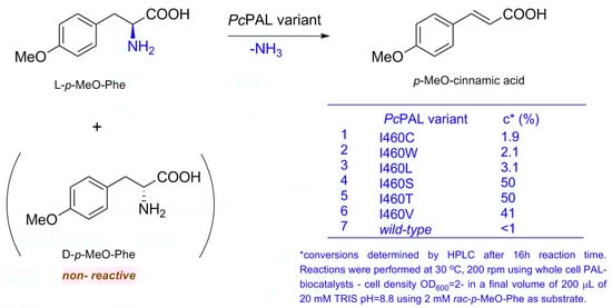 Further, the kinetic parameters of PcPAL variants I460T, I460V were determined within the ammonia elimination of p-MeO-Phe (Figure 5b, Table 1) and of the natural substrate l-phenylalanine (l-Phe) (Figures S14–S16, Table 1). Both I460V- and I460T-PcPAL showed similar catalytic efficiency within the ammonia elimination from the non-natural substrate p-MeO-Phe, while the wild-type PcPAL poorly catalyzed this reaction. Despite of the ~10 fold lower kcat values shown by the mutants within the ammonia elimination from p-MeO-Phe than that of the wild-type-PcPAL in the natural, l-Phe deamination reaction (Table 1), these mutants could be considered potent biocatalysts, since PALs with similar catalytic efficiencies were employed for efficient preparative biotransformations of several phenylalanine analogs [,,]. Interestingly, variant I460T exhibits significantly higher affinity towards the natural substrate, in comparison to reference mutant I460V, thus also preserving the specificity order shown by the wild-type PcPAL.