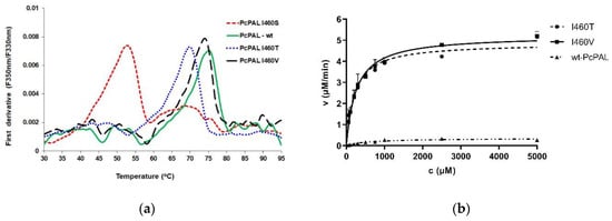 (a) The thermal unfolding temperature (Tm) of I460S PcPAL and I460T PcPAL, determined by nanoDSF (Prometheus NT.48). Fluorescence intensity ratios F350/F330 and their first derivative are represented as a function of the applied linear thermal ramp (b) Michaelis–Menten curves obtained by initial reaction velocity measurements using p-MeO-Phe as substrate at different concentration and purified PcPAL variants as catalysts.