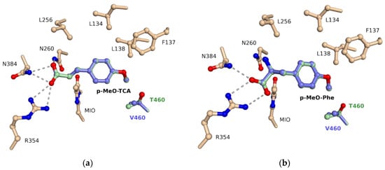 View of the catalytic site, including the electrophilic 4-methylideneimidazol-5-one (MIO) prosthetic group; overlay of the (a) p-MeO cinnamic acid and (b) p-MeO-Phe orientations within the catalytic site of I460V and I460T.