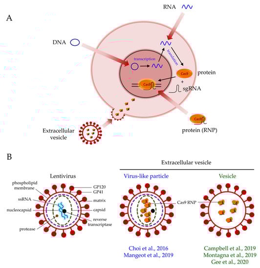 Extracellular vesicle-mediated delivery of Cas9 ribonucleoproteins (RNPs). (A) Cas9 can be delivered in the forms of DNA, mRNA, or protein. The protein format enables the immediate action of Cas9 when it is in the nucleus. The transduction of extracellular vesicles releases pre-loaded Cas9 RNPs into cells for efficient gene editing. (B) Structural differences between a lentivirus, a virus-like particle, and a vesicle.