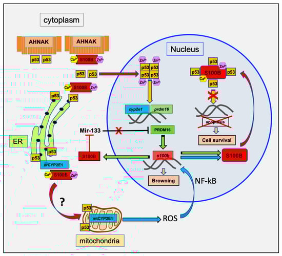 Schematic model of the transcriptional regulation of S100B for brown adipocyte differentiation. Activation of brown adipocyte differentiation triggers S100B transcriptional activation through ROS and PRDM16 pathways [15,28]. Increase in cytoplasmic S100B amplifies nuclear targeting of p53 and p53 transcriptional activation [38] and decreases miR-133 [28]. A negative regulation of p53 through cytoplasmic interaction with AHNAK is also suggested based on a study that characterized physical interactions between AHNAK and p53 and AHNAK-dependent inhibition of p53 nuclear activity [39]. Nuclear translocation of p53 further increases S100B expression level through synergistic transcriptional activation of both PRDM16 and CYP2E1-ROS pathways. Enhanced S100B expression results in S100B nuclear accumulation and down regulation of p53 transcriptional activity [20]. It is hypothesized that the nuclear S100B enhances survival of differentiated BAT by inhibition of nuclear p53-dependant apoptosis [40]. A contribution of S100B to the mitochondria addressing of CYP2E1 and p53 is also suggested (see Section 3 for details).