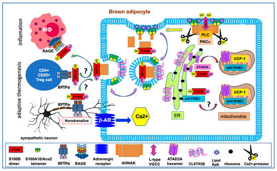 Schematic representation of beta-adrenergic receptors signaling and S100B functions for mitochondrial biogenesis and adipokinesis in brown adipocyte. Mammalian BAT is made up of specialized adipocytes that express uncoupling protein 1 (UCP1), which dissipates the mitochondrial proton gradient, forcing increased flux through the electron transport chain and subsequent heat generation. Brown fat is innervated by nerve endings of the sympathetic nervous system. Sympathetic neurons release noradrenaline molecules that bind to and activate the β3-adrenergic receptors (β-AR) on fat cells. This activation triggers a cascade of biochemical events, such as changes in cytoplasmic Ca2+ concentration, elevations of intracellular cAMP levels, activation of kinases cascades, and mitochondrial biogenesis [56]. β-AR stimulation also induces S100B transcription [15]. The cytoplasmic Ca2+/Zn2+-bound S100B assists the synthesis, folding, stability and/or subcellular addressing of nuclear (p53) or mitochondrial (ATAD3A, CYP2E1) S100B binding partners involved in brown adipocyte differentiation and mitochondrial biogenesis. Changes in cytoplasmic Ca2+ concentration also induce AHNAK proteolysis and Ca2+-dependent exocytosis of S100B-containing vesicles by means of enlargosomes. In the extracellular space, it is hypothesized that S100B binds to RPTPσ receptors on sympathetic neurons and Treg cells to support the development of functional beige fat. S100B can also bind to RAGE on macrophages. The S100B–RAGE axis contributes to the cross-talk between adipocytes and immune cells and may play a role in inflammation associated with obesity. See also Section 5 for details).