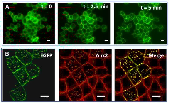 Finally, it is of prime importance to understand how AHNAK contributes to the exocytotic vesicle (enlargosome) formation. Increasing evidence suggests that the proteolysis of the membrane bound AHNAK protein is key (Figure 3). AHNAK1 is highly sensitive to metal-dependent proteases [91] and calcium-dependent proteolysis leads to the cleavage of AHNAK1 at specific sites on N- and C- terminal domains [92]. AHNAK1 contained in purified EVs migrates as a set of shorter peptides compared to the full length AHNAK1, supporting the hypothesis that AHNAK1 proteolysis accompanies vesicle formation (this evidence is supported by comparing Figure 10 panel c and panel f in [93] and in Figure 7a of [94]). Such a scenario is further supported by the finding that targeting the C-terminal domain of AHNAK1 (residues 5645–5673) to the membrane bound annexin2/S100A10 complex, in place of the full length AHNAK1, was sufficient to cause membrane blebbing that evolves into vesicular structures (Figure 4). In this study, we have overexpressed the minimal S100A10/annexin2 binding domain 1 of AHNAK1 (A2tBP1-residues 5645-5673) in MDCK cells using a plasmid expressing four A2tBP1 sequences in tandem repeats (A2tBP14-EGFP) [80,81]. The intracellular distribution of the A2tBP14-EGFP peptide and annexin2 subcellular localization were studied during Ca2+ switch experiments by live fluorescence imaging. As observed with the endogenous full length AHNAK [79], Ca2+ addition to the culture medium induces a translocation of A2tBP14-EGFP from the cytoplasm to the plasma membrane within 2 min (Figure 4A). At the plasma membrane, the A2tBP14-EGFP peptide competes with the full length AHNAK for binding to the S100A10/annexin2 complex [80] and induces formation of membrane vesicles (Figure 4B).
