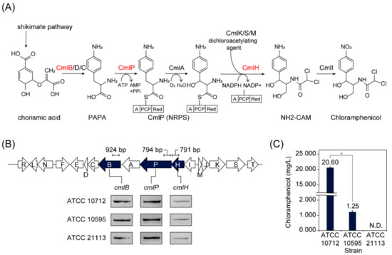 Screening S. venezuelae strains harboring chloramphenicol biosynthetic gene cluster (BGC). (A) Biosynthetic pathway of chloramphenicol. The three selected genes for PCR are colored as red. PAPA, L-p-aminophenylalanine; NRPS, non-ribosomal peptide synthetase; NH2-CAM, D-threo-1-(4-aminophenyl)-2-dichloroacetylamino-1,3-propanediol. (B) Organization of chloramphenicol BGC and detection of the three genes from the three S. venezuelae strains (ATCC 10712, ATCC 10595, and ATCC 21113). The three selected genes for PCR are colored navy. (C) Chloramphenicol production of the three S. venezuelae strains. N.D., Not detected. An asterisk indicates p-value < 0.05 (Wilcoxon rank-sum test).