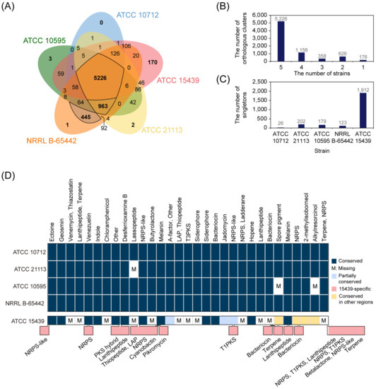 To investigate the differences in coding regions among the five S. venezuelae strains (ATCC 10712, ATCC 21113, ATCC 10595, NRRL B-65442, and ATCC 15439), protein sequences from the strains were compared using OthoVenn2 [28], which compared all input protein sequences and predicted orthologous genes that were conserved among the selected organisms. There were 5226 orthologous genes shared by the five strains (Figure 4A,B). In addition, four closely related S. venezuelae strains shared 963 additional orthologous genes, resulting in a total of 6189 core orthologous genes among the four strains. These genes accounted for 86.9% (ATCC 10712), 90.9% (ATCC 21113), 92.2% (ATCC 10595), and 85.4% (NRRL B-65442) of the total protein-coding genes of each strain, indicating that most of the protein-coding genes in the four strains were conserved. In particular, ATCC 10712 and NRRL B-65442 shared 445 additional orthologous genes, whose location was particularly concentrated in the range of 6 to 6.3 Mbp and the region was not presented in the genomes of ATCC 21113 and ATCC 10595 (Figure S3A,B). In addition, 26.3% of the orthologous genes between ATCC 10712 and NRRL B-65442 were located at 2.1–2.4 Mbp, indicating that the variations were grouped in several regions in the genome, not limited to the end of the genome. Compared to the other strains, ATCC 15439 had many strain-specific genes, including 170 inparalogs that present as orthologous genes in a single strain and 1912 singletons that present as a single gene in a single strain (Figure 4C). In sum, ATCC 15439 showed a difference in gene contents from other S. venezuelae strains, whereas closely related S. venezuelae strains shared more than 85.4% of total genes.