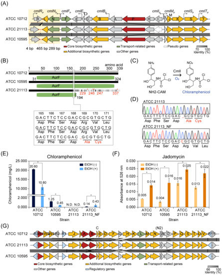 The jadomycin BGC was also conserved in the four closely related S. venezuelae strains. However, jadomycin production has been conducted only in ATCC 10712 [8,31,53,54]. Under normal MYM culture conditions, the jadomycin biosynthesis levels of ATCC 21113 and ATCC 21113_NF were higher than those of ATCC 10712 and ATCC 10595 (Figure 5F). As ethanol shock (ES) treatment is a common practice to induce the jadomycin production in ATCC 10712 [54], we measured the jadomycin production levels of the closely related strains in response to ES treatment. As expected, jadomycin production was significantly increased in the four strains under the ES condition (Wilcoxon rank-sum test, p-value < 0.05) (Figure 5F). Among the strains, ATCC 21113 and ATCC 21113_NF still showed higher jadomycin production levels than ATCC 10712 and ATCC 10595. In contrast, chloramphenicol production levels were reduced by 1.9- and 2.8-fold in ATCC 10712 and ATCC 10595, respectively, compared to the normal MYM culture condition (Figure 5E). This result indicates that the jadomycin and chloramphenicol biosynthesis were regulated antagonistically upon ES treatment, which is consistent with the results in the galactose–isoleucine medium that ES treatment induces jadomycin biosynthesis and inhibits chloramphenicol biosynthesis [43]. However, in ATCC 21113_NF, ES treatment stimulated the chloramphenicol production (3.1-fold, p-value < 0.05), whereas less change was observed in jadomycin production.