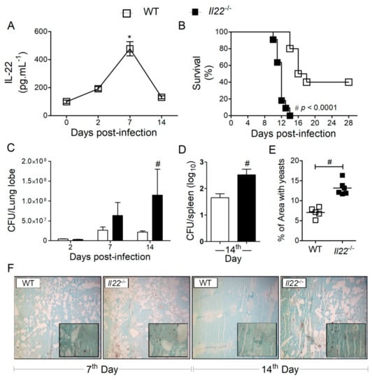 Figure 1. The absence of IL-22 increases the fungal load and the susceptibility of mice infected with Histoplasma capsulatum. Eight-week-old C57Bl/6 mice (WT) were infected i.t. with a lethal inoculum (1 × 106 yeasts) of H. capsulatum. On days 2, 7 and 14 post-infection, the mice were euthanized, the lungs removed and homogenized for quantification of IL-22 by ELISA (A). WT or Il22−/− mice were infected i.t. with a lethal inoculum (1 × 106 yeast) of H. capsulatum and observed daily for determination of the survival curve (B). Data were analyzed by log-rank test and Mantel–Cox in the post-test (n = 10). In independent experiments, infected mice were euthanized on days 2, 7, and 14 post-infection, and the lungs (C) and spleens (D) were removed and processed for fungal load analysis by yeast colony forming units (CFU) assay. Data are expressed as mean ± SEM of three independent experiments (n = 6–11) and analyzed by the two-way ANOVA test and Bonferroni in the post-test or analyzed by Student’s t-test (n = 5). Data were considered statistically significant when p < 0.05, * infected vs. uninfected and # WT + Hc vs. Il22−/− + Hc. The mean right lobe was removed on days 7 and 14 after infection, fixed in formalin and embedded in paraffin. Five-micrometer sections were stained by the Grocott’s method through impregnation of silver methenamine (GMS), and analyzed by light microscopy, by 100× and 400× (in set) resolution (F). Images obtained on 7th day post-infection were quantified in the ImageJ software, regarding % of area covered by yeasts (E). Data are expressed as mean ± SEM of a representative experiment (n = 4–6) and analyzed by Student’s t-test.