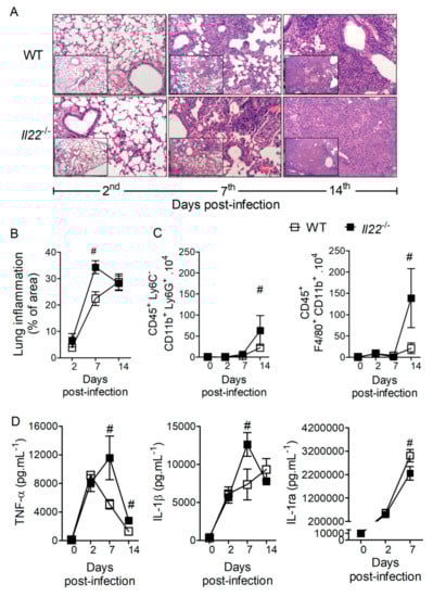 Figure 2. IL-22 deficiency enhances the recruitment of neutrophils and macrophages and modulates the cytokines IL-1β, TNF-α and IL-1ra in H. capsulatum infected lungs. Eight-week-old WT or Il22−/− mice were infected i.t. with a lethal inoculum (1 × 106 yeasts) of H. capsulatum and euthanized on days 2, 7 and 14 after infection. The mean right lobe was removed, fixed in formalin and embedded in paraffin. Five-micrometer sections were stained by HE and analyzed by light microscopy, with magnification of 200× and 100× (in set) (A). Images were quantified in the ImageJ software, regarding % of infiltrated area (B). On days 2, 7 and 14 after infection, the upper left lobe was removed, disrupted, counted and evaluated by flow cytometry for the presence of neutrophils CD45+ Ly6C Ly6G+ CD11b+ and macrophages CD45+ F4/80+ CD11b+ (C). The absolute number of cells is shown as mean ± SEM, of two independent experiments (n = 4–16). To determine IL-1β, TNF-α and IL-1ra production, the lower and upper right lobes were removed, homogenized and the supernatants used for quantification by ELISA (D). Data are expressed as mean ± SEM of two independent experiment (n = 4–16) and analyzed by the two-way ANOVA and Bonferroni test in the post-test. Data were considered statistically significant when p < 0.05, # WT + Hc vs. Il22−/− + Hc.