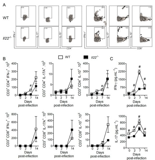 Figure 4. IL-22 deficiency alters frequency of T cells, the production of IFN-γ and IL-17 in H. capsulatum infected-lungs. Eight-week-old WT or Il22−/− mice were infected i.t. with lethal inoculum (1 × 106 yeasts) of H. capsulatum and euthanized on days 2, 7 and 14 after infection. The upper left lobe was removed, disrupted and evaluated by flow cytometry for the presence of Th1 (CD3+CD4+IFN-γ+), Th17 (CD3+CD4+IL-17A+), Treg (CD3+CD4+IL-10+), Tc1 (CD3+CD8+IFN-γ+), Tc17 (CD3+CD8+IL-17A+) and TcRegs (CD3+CD8+IL-10+). Representative zebra plots of CD4 T cells (7 dpi) and of CD8 T cells (14 dpi) were illustrated (A). The absolute number was expressed as mean ± SEM, of two independent experiments (B). To quantify IFN-γ and IL-17, the lower and upper right lobes were removed, homogenized and the supernatants used for ELISA assay (C) (n = 4–6). Data were analyzed by the One-Way ANOVA with Newman-Keuls multiple comparison test and considered significant when p <0.05, #WT + Hc vs. Il22−/− + Hc.