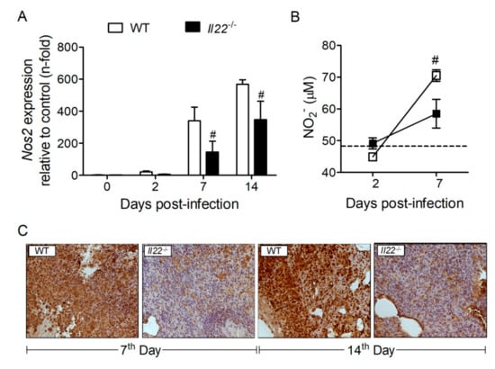 Figure 5. NOS type 2 and NO2 were diminished in lung parenchyma of Il22−/− mice. Eight-week-old WT or Il22−/− mice were infected i.t. with lethal inoculum (1 × 106 yeast) of H. capsulatum. The left lower lobe was removed, and the RNA extracted for analysis of the gene expression of the enzyme Nos2 by RT qPCR (A). On days 2 and 7 post-infection, the lower and upper right lobes were removed, homogenized in 1 mL of PBS 1× and the supernatant was used to quantify NO2 (μM) by using a Griess reaction (B). On days 7 and 14 post-infection the medium right lobe was removed, fixed in formalin and embedded in paraffin. Five-micrometer sections were labeled with anti-Nos2 primary antibody, biotinylated anti-IgG secondary antibody and substrate. The sections were counterstained by Mayer’s hematoxylin and analyzed by light microscopy, at 400× (C). Data were expressed as mean ± SEM of a representative experiment (n = 4–7) and analyzed by the two-way ANOVA test and Bonferroni post-test and considered significant when p < 0.05, #WT + Hc vs. Il22−/− + Hc.