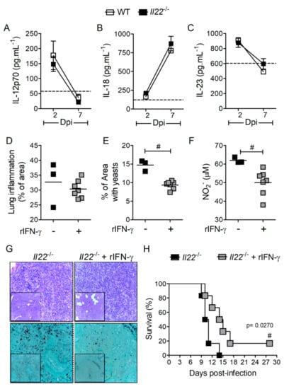 Figure 6. IL-22 absence did not compromise IL-12p70, IL-18 and IL-23 cytokine production in Hc-infected lungs, but rIFN-γ treatment, rescued IL-22 deficient mice from death. Eight-week-old WT or Il22−/− mice were infected i.t. with lethal inoculum of H. capsulatum and euthanized on days 2 and 7 after infection. The lower and upper right lobes were removed, homogenized and the supernatant was used for quantification of IL-12p70 (A), IL-18 (B) and IL-23 (C) by ELISA and NO2 (μM) by using a Griess reaction at 7th day post-infection (F). (n = 4–6). Data were analyzed by the two-way ANOVA test and Bonferroni post-test or by Student’s t-test and considered significant when p < 0.05, #WT + Hc vs. Il22−/− + Hc. Il22−/− mice infected with lethal inoculum (1 × 106 yeasts) of H. capsulatum were treated 1× a day with 1 μg rIFN- γ (i.n.) from the 4th day of infection. On day 7 post-infection, the medium right lobe was removed, fixed in formalin and embedded in paraffin. Five-micrometer sections were stained by HE or Grocott’s method (G) and analyzed by light microscopy, with a magnification of 200× and 100× (in set). Images (400× resolution) were quantified in the ImageJ software, regarding % of infiltrated area (D) or % of area covered by yeasts (E). To determine the survival rate, animals from all groups were observed daily (H). Data were analyzed by the log-rank test and Mantel–Cox in the post-test (n = 6). Data were considered statistically significant when p < 0.05. #Il22−/− + Hc vs. Il22−/− + Hc + IFN-γ.