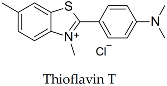 The aggregation of beta-amyloid peptides has been investigated extensively in the last 20 years [8]. In the amyloid fibrils, the amino-terminal end of the amyloid-beta peptide is exposed to the interaction with other molecules, while the middle region and the carboxyl-terminal end of the peptide are involved in intramolecular and intermolecular interactions between molecules of Aβ [9]. Molecules which belong to various classes were analyzed in previous studies as non-covalent binding partners for Aβ peptide: antibodies, peptides, proteins and low molecular weight molecules [3,4,8,10]. The methods employed most often for comparing aggregation, and particularly amyloid fibril formation using different experimental conditions, are the thioflavin T assay (Figure 1), transmission electron microscopy, atomic force microscopy, and scanning electron microscopy. Sandwich ELISA and UV spectroscopy were also described for quantifying the degree of aggregation, although these methods do not distinguish between the form of the aggregated peptide, namely oligomers or fibrils [11,12].