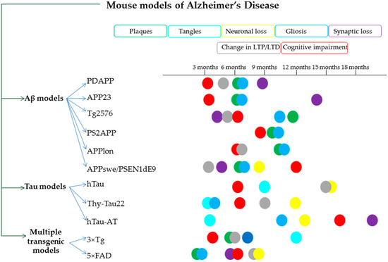The insufficient therapeutic efficacy of currently approved drugs necessitates the introduction of better in vivo preclinical models able to reproduce AD pathology, especially in the pre-symptomatic phase, and then to explore useful tools for preventive and therapeutic screening [17,18]. In response to this need, more than 180 transgenic/knock-out/knock-in AD models have been developed that are mostly centered alone or in combination with human gene mutations in APP, presenilin 1 (PSEN1), apolipoprotein E (APOE), microtubule-associated protein tau (MAPT), and triggering receptor expressed on myeloid cells2 (Trem2) or Beta-Secretase 1 (BACE1). Figure 2 presents the pathological changes and the neurological deficits of the most common mouse transgenic models of AD used in research: Aβ models: PDAPP [19], APP23 [20,21], Tg2576 [22,23], PS2APP [24], APPlon [25], APPswe/PSEN1dE9 [26]; tau models: hTau [27], Thy-Tau22 [28], hTau-AT [29] and multiple transgenic models: 3×Tg-AD [30] and 5xFAD [31]. Although none of these models completely replicates the most important features of human AD, in vivo models provide context and relevance insight into the pathological alterations that define this condition [32,33,34,35,36].