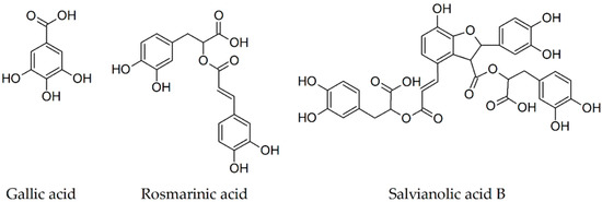 The anti-amyloidogenic activity of gallic acid through gavage against cerebral Aβ/β-amyloid pathology at a daily dose of 30 mg/kg (dissolved in sterile water at the concentration of 3 mg/mL) for 30 days in APP/PS1 double transgenic mice (starting at 4 or 9 months of age) was evaluated by Yu et al. [41]. After one month of therapy with gallic acid, the brain sections of the 9-month-old APP/PS1 mice stained either with thioflavin S or with an amyloid plaque specific antibody 6E10 revealed an important reduction in the size of Aβ1-42 plaques, not in their numbers. In addition, GA in a 9-day behavioral assessment battery not only proved to be effective in improving the spatial reference and working memories of 4-month-old transgenic mice (low plaque stage), but also significantly reduced the most severe deficits of cognitive functions developed by the 9-month-old AD mice (high amount of brain Aβ plaque depositions). Taken together, these findings lead to fact that gallic acid (Figure 3) shrank the size of Aβ aggregates, although the mechanism of action remains unclear and possibly prevented plaque development in the brain. All data support the idea that gallic acid may be added in the future as a possible multitarget pharmacological compound in the prevention or treatment of Alzheimer’s disease.