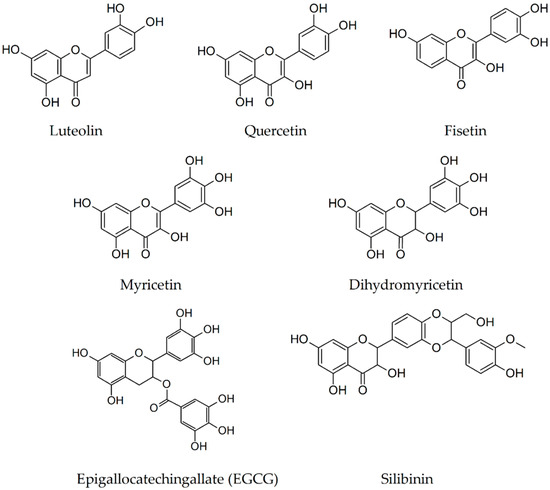 Yin et al. reported, in the year 2011, the results of the thioflavin T assay employed for the study of the inhibition of Aβ(1-42) peptide aggregation exerted by increasing concentrations of silibinin (0.1, 1, 10, and 100 μM) incubated with Aβ(1-42) at 20 μM concentration [65]. According to these results, a solution of 100 μM silibinin decreased with 70% the aggregation of the Aβ(1-42). Silibinin, as a dual potential inhibitor of acetylcholinesterase and Aβ peptide aggregation for AD therapy, was evaluated on APPswe/PS1dE9 double Tg mice model by Duan et al. [66]. Intraperitoneal daily administration of 200, 20, or 2 mg·Kg−1 of silibinin (suspended in 0.5% carboxymethylcellulose sodium solution) for 4 weeks resulted in an amelioration of cognitive deficits, a remarkable reduction in the surface area of Aβ plaque aggregates in the cortex and hippocampus (mainly 20 mg group), a decrease in the activity and quantity of acetylcholinesterase, as well as an increase in synaptic protection, gliogenesis, and neurogenesis. These data highlight that silibinin (Figure 4) plays an effective role in preventing the aggregation of Aβ by binding to the Aβ1-42, acting not only as a dual inhibitor of Aβ aggregation and acetylcholinesterase, but also as a neurogenic agent, being a “one molecule-multiple targets” promising compound in AD therapy.