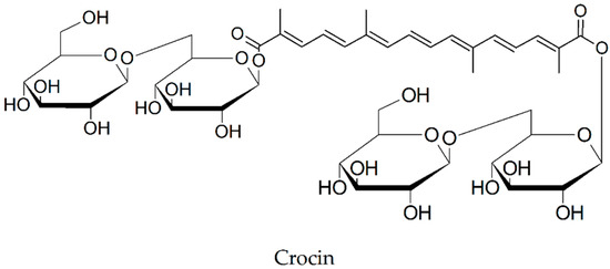 The effects of 1-month dietary supplementation of crocin (10 mg/kg/day) on beta-amyloid load and related toxicity were evaluated in 5XFAD transgenic and wild-type mice by Batarseh et al. [78]. Using ELISA, the researchers showed that crocin (Figure 7) consumption was able to decrease Aβ(1-40) by 25% and Aβ(1-42) levels by 29% in brain homogenates compared with control group. At least in part, the reduction in total Aβ levels might be explained by an increase in the expression of neprilysin (NEP) and up-regulation of the ApoE-clearance pathway.