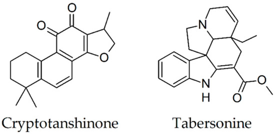 Chronic therapy for 4 months with oral cryptotanshinone at the doses of 5, 15, and 30 mg/kg/day was associated in Morris water maze evaluation with an important amelioration of spatial learning and memory deficits of APP/PS1 mice. There was no statistically significant difference between 15 and 30 mg cryptotanshinione-treated groups. In addition, a modified immunohistochemical method revealed significant attenuation of Aβ deposits in the cortex and hippocampus. The authors suggested as the mechanism involved in the positive effects of cryptotanshinone (Figure 8) on β-amyloid deposition attenuation in transgenic AD mice amyloid precursor protein metabolism modulation by upregulating α-secretase [80].
