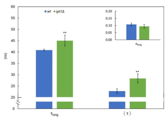The fluorescence intensity decay of t-PnA incorporated in the plasma membrane of S. cerevisiae cells is properly described by four exponentials, where the long component lifetime (τlong) gives information about the relative degree of hydrophobic packing of gel domains and its amplitude (normalized pre-exponential) about their relative abundance [55]. For wt cells, the long lifetime component was 40.9 ± 0.4 ns, a value similar to that obtained in our previous work (~41 ns) [11], while for ipt1Δ cells it was 45.1 ± 2.4 ns (Figure 1–τlong). Since this parameter is higher than 30 ns for both strains, it reveals the presence of gel domains in the plasma membrane [11]. Moreover, both the long-lifetime component and the intensity weighted mean fluorescence lifetime (Figure 1—⟨τ⟩) were even longer in ipt1Δ cells than wt cells. Similar results were obtained for cells grown in YPD medium (Supplementary Material Figure S3).
